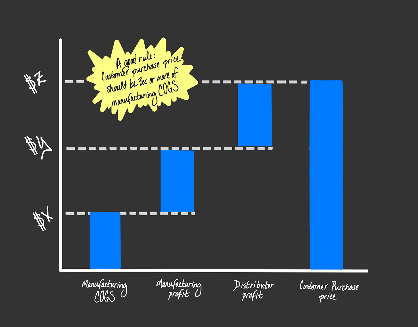 If the price that a customer is willing to pay ($Z) is significantly higher than the cost of manufacturing/assembling the product ($X), such that both you and the distributor can run a profitable business off of that margin, you’re good. Expected margins can vary, but a good rule of thumb is that you want the customer selling price to be 3x or more of your COGS. Z>3X is a decent business, and anything less than that is going to be on the struggle bus.